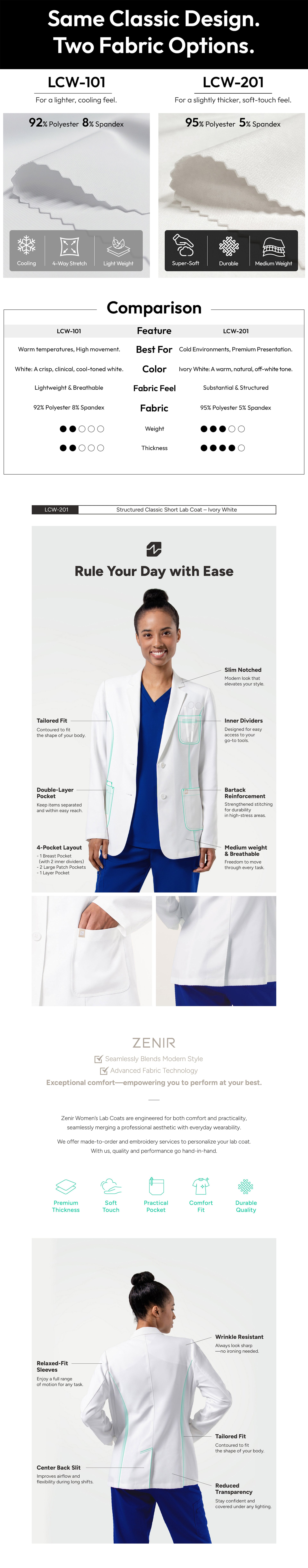 The LCW-201 Structured Classic Short Lab Coat prioritizes comfort without compromising professional standards. Crafted from breathable, soft-touch fabric, this coat adapts to your body's natural movements, reducing fatigue during demanding shifts.
