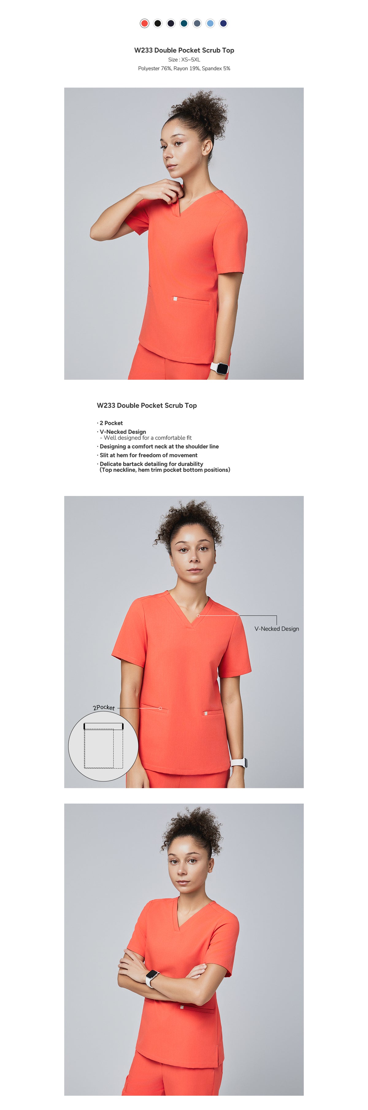 Upgrade your workwear with our Double Pocket Scrub Top, designed for both functionality and style. The pocket top ensures easy access to essentials while offering a sleek fit.